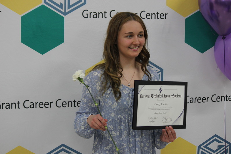 Grant Career Center inducted 34 students into The Elizabeth Abbott Chapter of the National Technical Honor Society. This year’s inductees include students from 12 different programs: Allied Health, Automotive Collision, Cosmetology, Construction Technology, Culinary Arts, Criminal Justice, Early Childhood Education, Information Technology, Manufacturing Engineering Technology, Metal Fabrication, Large Animal Science, and Veterinary Science. The inductees were selected by a committee of faculty members based on academic requirements, attendance, leadership, and character. The ceremony also included a presentation of what the students have accomplished, with quotes from their instructors at Grant Career Center.